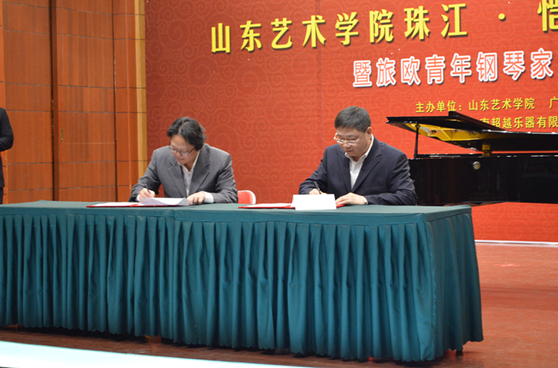 山东艺术学院党委副书记王力克与广州珠江钢琴集团党委副书记、董事黄贤兴代表双方签订合作协议