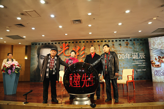 省委宣传部副部长王红勇、山东艺术学院院长张志民和项堃子女进行项堃百年诞辰影展启动仪式