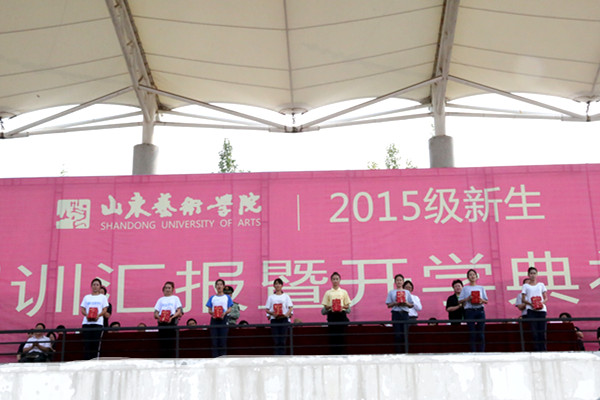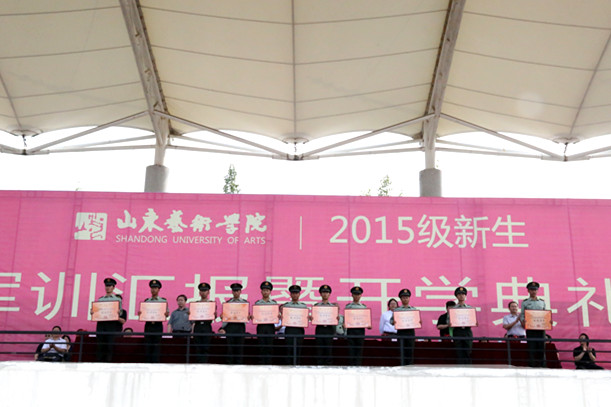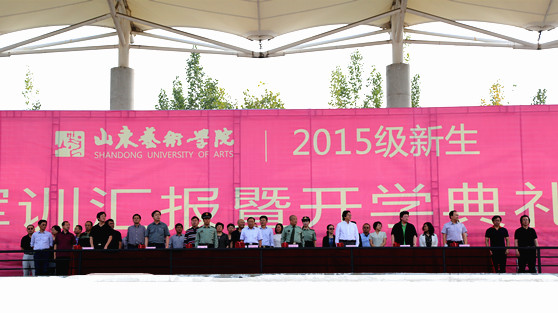 9月25日上午,山东艺术学院2015级新生军训汇报暨开学典礼在长清校区体育场举行。学校党委书记李宗伟,院长张志民,党委副书记王力克,副院长刘大力、刘晓静、高启光,纪委书记兰绍彤,承训部队领导刘勇等参加了开学典礼。典礼由刘大力主持。