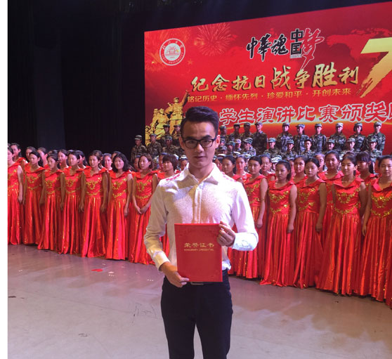 9月25日,为弘扬伟大的爱国主义精神,铭记历史、缅怀先烈,由中共山东省委高校工委、新华网山东频道主办的全省高校大学生“中华魂·中国梦”纪念抗日战争胜利70周年演讲比赛决赛在临沂大学举行,山艺戏剧影视学院2012级播音与主持艺术专业的陈钊同学荣获一等奖。