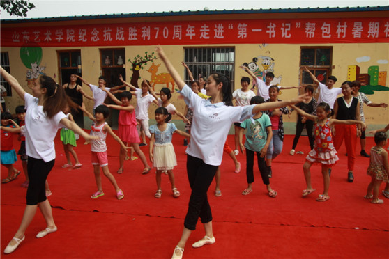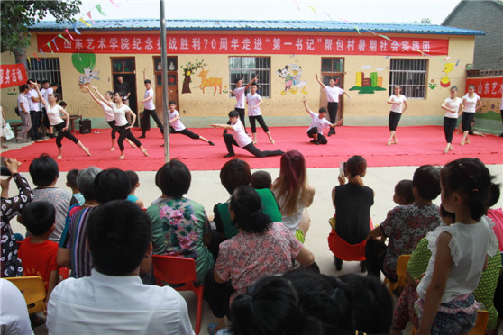 为响应共青团中央关于开展大学生暑期“三下乡”社会实践的号召,组织引导青年学生在深入社会、了解国情、接受锻炼的过程中培育和践行社会主义核心价值观,以“艺术下乡、文化惠民”的实际行动支持配合省派驻村“第一书记”抓党建、促脱贫,山东艺术学院团委、艺术实践与创作处、舞蹈学院联合组织了纪念抗日战争胜利70周年赴“第一书记”帮包村暨“走进舞蹈”系列行公益展演。学校党委组织部负责人、舞蹈学院党总支负责人、校团委、艺术实践与创作处相关负责人、三位驻村第一书记及数百名帮包村群众观看了演出。