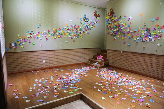 展览仪式结束后,剪纸班的学员们现场进行剪纸动态展示,学员们手持剪纸作品进行了精彩的表演。这种新颖的创意表演,广受欢迎,现场掌声阵阵。随后,大家走进文化馆东大厅,参观剪纸与草柳编作品的静态展示。