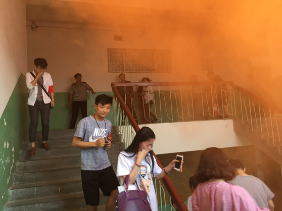随着火情警报响起,老师们从就近的消防箱取出灭火器,对准着火点(烟幕弹)喷射。同时,学生干部按照各自分工,迅速组织正在上课的同学往楼外广场疏散。此时,五层楼道已布满了烟雾。只见路过的同学都用袖口或手臂捂住嘴巴,弯着腰有序撤离。不到一刻钟时间,100多名师生安全撤离到达目的地。