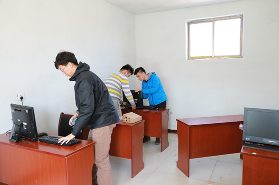 学生志愿者为农家书屋搬运桌椅、打扫卫生、安装调试设备