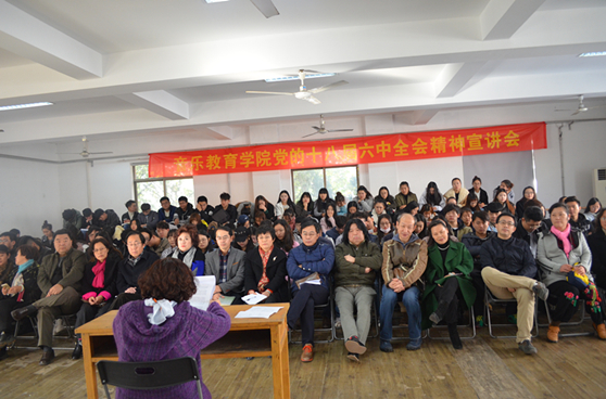 会上,杨春红传达了《中国共产党第十八届中央委员会第六次全体会议公报》,音乐教育学院院长孙建滨传达了大众日刊发的文章《紧密团结在习近平同志为核心的党中央周围坚决贯彻落实六中全会确定的各项任务》,邹坤萍传达了学校党委书记李宗伟同志在学校党委中心组(扩大)会议上的讲话,并对学习贯彻全会精神提出了要求。