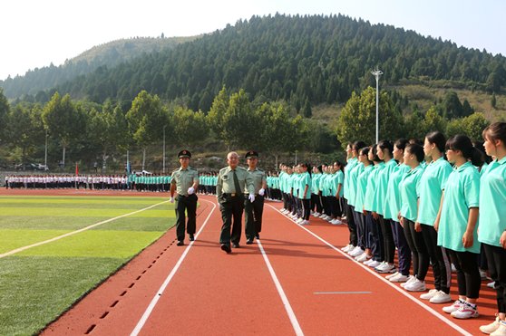 院长张志民在军训教官的陪同下依次检阅受训方队