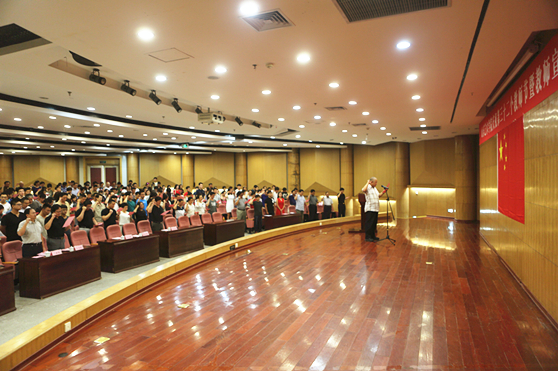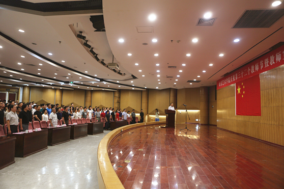 张志民带领与会全体教职工进行了隆重而庄严的集体宣誓。大家举起右手庄严宣誓,“我是一名光荣的人民教师,我庄严宣誓:始终忠诚于党和人民的教育事业,坚决贯彻党的教育方针和文艺方针,努力践行社会主义核心价值观;立德树人,为人师表;甘守三尺讲台,潜心传道授业;追求德艺双馨,关爱学生成长,立志做有理想信念、有道德情操、有扎实学识、有仁爱之心的好老师;为促进文化传承与社会进步,实现中华民族伟大复兴的中国梦,奉献全部智慧和力量!”充满激情、铿锵有力的誓言表达了他们忠诚于党的教育事业的坚定信念。