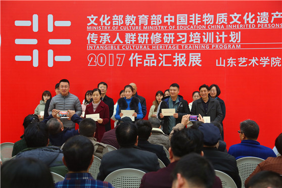 12月23日上午,文化部、教育部“中国非物质文化遗产传承人群研修研习培训计划”山东艺术学院2017年结业作品展在山东省文化馆开幕。山东省文化馆馆长王衍良,山东艺术学院艺术管理学院、设计学院的师生,学校相关部门负责人,2017年培训班的学员们参加活动。