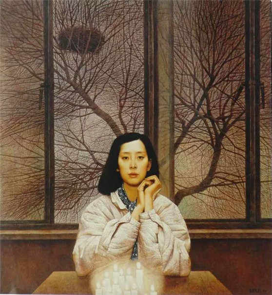 雀巢寄深意,烛光照华年。甲午英魂烈,雪国思难眠。画笔切真处,诗性动心弦。岱岳吟高松,大河鼓征帆。(注:“雀巢”“甲午”“雪国”皆为王力克画题。)
