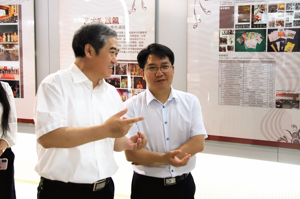 调研过程中,邓云锋不时与学校领导交流,了解学校办学情况,询问发展中遇到的实际问题。校领导从办学特色、人才培养、专业建设等方面向邓云锋一行介绍了学校基本情况,重点介绍了学校围绕服务新旧动能转换重大工程、乡村振兴战略,开展专业建设、教学工作和艺术实践等方面的情况及取得的成绩。