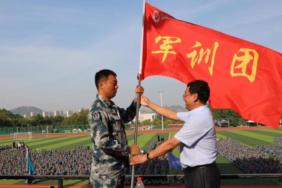 孔祥华为军训团授旗,代表学校党委、行政对承训单位北部战区空军94326部队和全体教官表示热烈欢迎和衷心感谢!向参加军训的同学们和参与军训工作的干部、老师表示诚挚问候!他指出,今年正值学校建校60周年,学校党委、行政高度重视学生军训工作,各单位、各学院和军训团要全面把握和落实学校关于学生军训工作的指示精神,认真做好方案实施,确保学生军训顺利圆满。