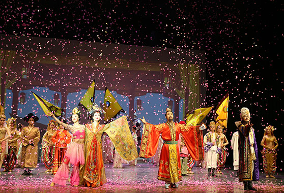 大漠孤烟,长河落日,丝路驼铃,飞天乐舞。由甘肃省歌舞剧院带来的舞剧《丝路花雨》以和平、友谊为主题,共分六幕,融合印度舞、黑巾舞、波斯马铃舞、波斯酒舞、盘上舞等各种艺术形式于一身,展示出劳动人民创造敦煌文化的光辉艺术历程,演绎了一部丝绸之路上“和平相处、互惠合作、共融发展”的世界主题歌。