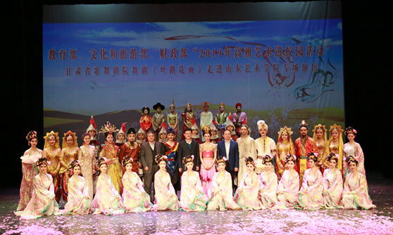 3月27日,2019年高雅艺术进校园活动中国经典舞剧《丝路花雨》在我校文东校区艺术剧场隆重上演。省教育厅(省委教育工委)二级巡视员张士俊,我校党委书记马东骅、纪委书记兰绍彤,甘肃省歌舞剧院艺术总监张稷,以及相关专业师生、社会各界人士一同观看演出。