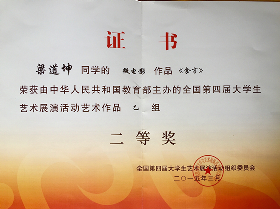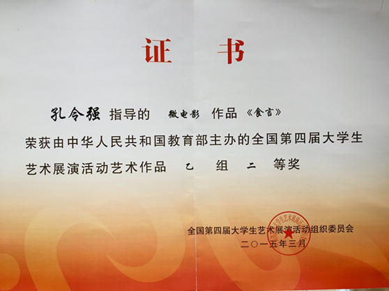 2月26日至3月2日,由教育部和天津市人民政府主办的全国第四届大学生艺术展演活动评选及现场集中展演在天津举行。我院广播电视编导(艺术传媒)专业梁道坤同学的微电影作品《食言》在评选活动中荣获艺术作品类专业组二等奖,孔令强老师荣获指导教师二等奖。