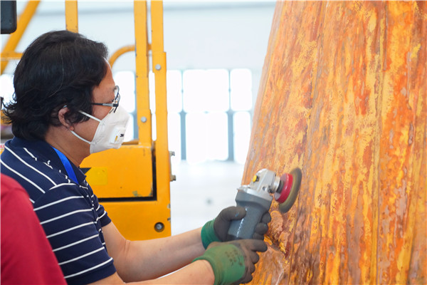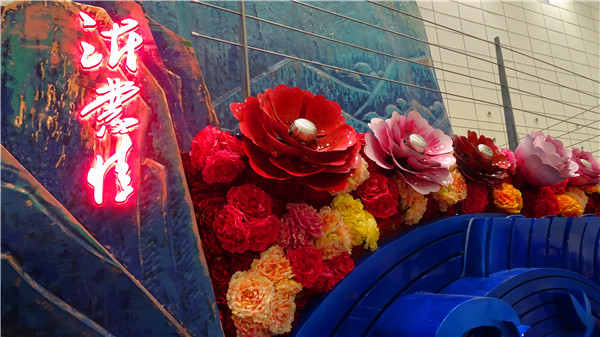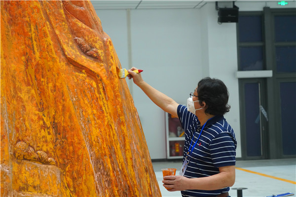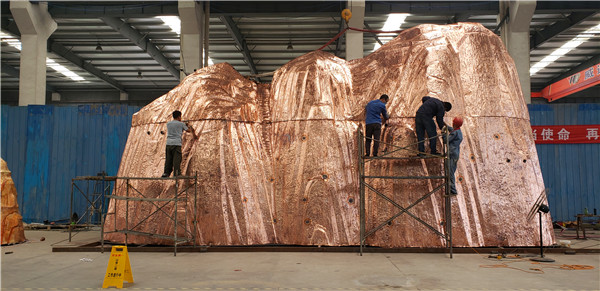 王力克:另外,在制作中“手工制作”的工匠精神也体现出山艺作品的温度。紫铜山体的肌理脉络、色彩表现和盛开的牡丹花都是人工一锤一锤精雕细琢的。我们团队的艺术家对于手工制作有一种特殊的情感,从事美术和设计的人把“手工”看得是至高无上的。所有的设计稿从一开始都是手绘的,进行到一定程度才有了计算机的辅助。他们把手绘这个环节看得特别重要,因为它是真实的思想、真实情感的表现。彩车其他各部分文化元素的艺术表现手法也都经过团队艺术家们的反复实验、创新,找到最佳的效果,复杂繁重的人工细部处理,也都充分体现出山艺师生们的工匠精神与坚忍不拔的毅力。