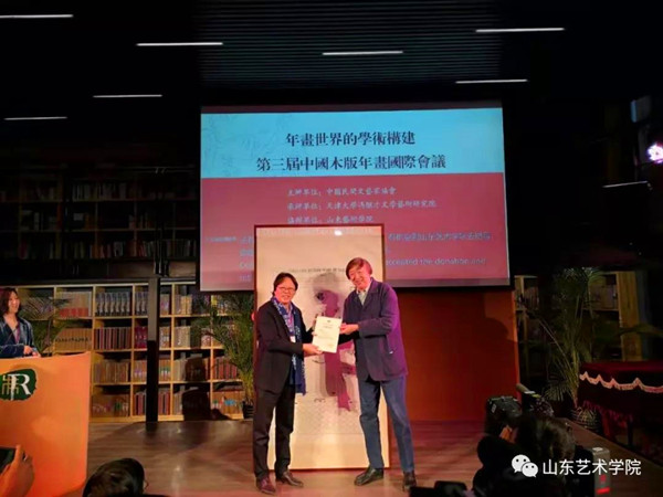 仪式上,山东艺术学院向会议赠送了巨幅古版新印年画清代文财神,冯骥才向王力克颁发捐赠证书。