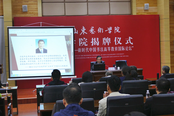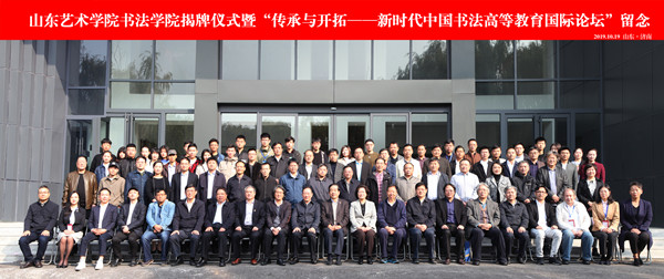 10月19日,山东艺术学院书法学院揭牌仪式暨“传承与开拓——新时代中国书法高等教育国际论坛”开幕式在山东艺术学院长清校区举行。全国政协常委、中国书法家协会主席苏士澍,山东省政协副主席、党组副书记吴翠云,山东省委宣传部副部长程守田,中国书法家协会副主席、教育委员会主任翟万益,山东省文联党组书记王世农,山东艺术学院院长王力克共同为山东艺术学院书法学院揭牌,中国书法家协会分党组副书记、秘书长郑晓华宣读中国书法家协会贺信。揭牌仪式由山东艺术学院党委书记马东骅主持。