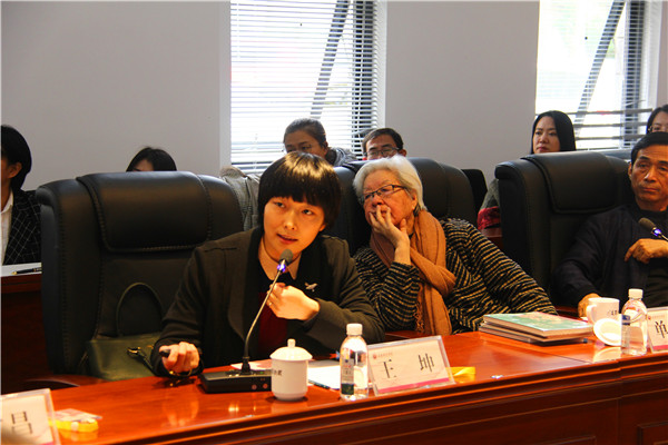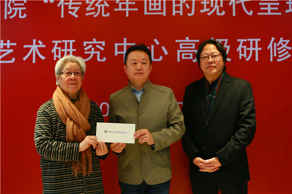 “传统年画的现代呈现”学术研讨会由赖冰梅主持。单应桂就年画绘、刻、印进行阐述,提出木版年画的改革必须改变画刻印分家的状况,她强调当木版年画家掌握了刻刀,等于完成了自己艺术修炼中的重要环节,成为一个全面掌握年画艺术语言的人,刻刀将成为传达自己情感的工具,突破形似从而达到神似。王坤从何谓传统年画、当代社会中的传统生活、年画与时代及年画与现代生活四个方面表达了对传统年画现代呈现的观点。提出了在由传统农耕文明向现代工业文明转型的过程中,应对传统生活进行重新认识与定位,还其应有的地位与价值,使其在社会转型的当代生活中继承传承与发扬。与会嘉宾就此次会议主题分别发言讨论。张丽华作总结发言,指出了传统年画要素的重要性,提出民俗中未曾在年画中表现的某些元素在年画领域有一定的展示空间。他对参加此次年画研修班的学员及年画艺术研究中心研究生寄予厚望,希望各位学员及研究生们可以在单应桂老师的指导下把星星之火发展为燎原之势,共同为年画事业贡献自己的力量。
