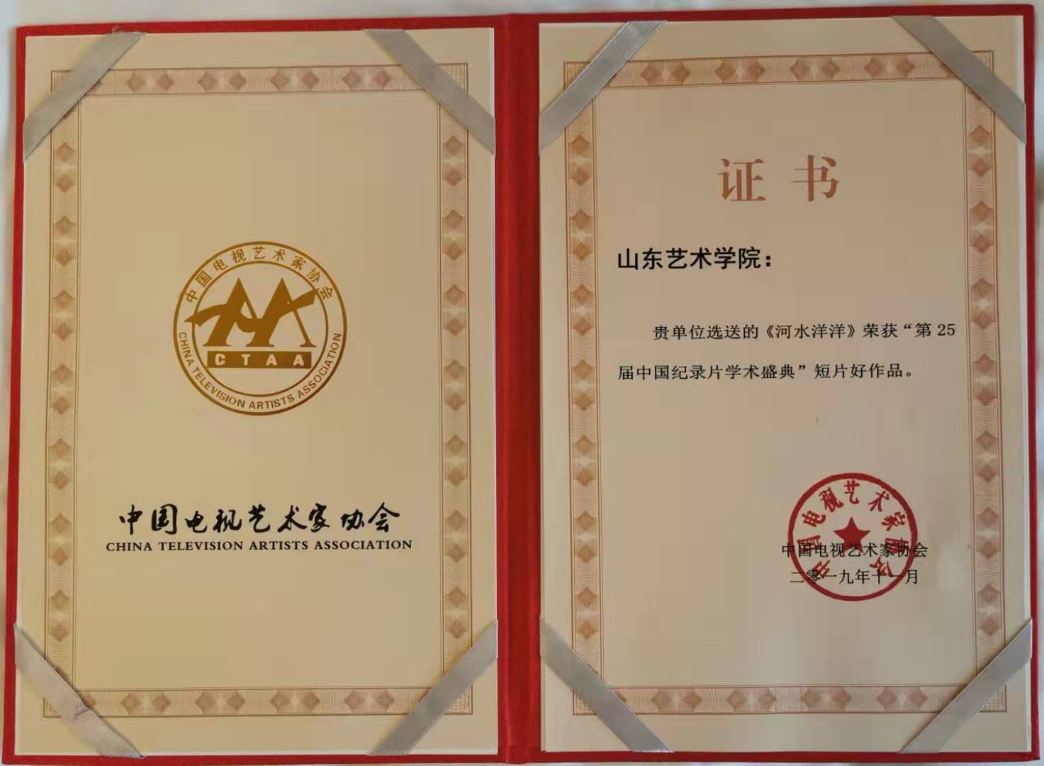 11月27日,在由中国电视艺术家协会、中共深圳市委宣传部、深圳市文学艺术界联合会主办的第25届中国纪录片学术盛典暨第6届深圳青年影像节中,山东艺术学院电影学院副教授常秀芹带领她的研究生团队创作的纪录片《河水洋洋》荣获第25届中国纪录片学术盛典短片“好作品”奖。