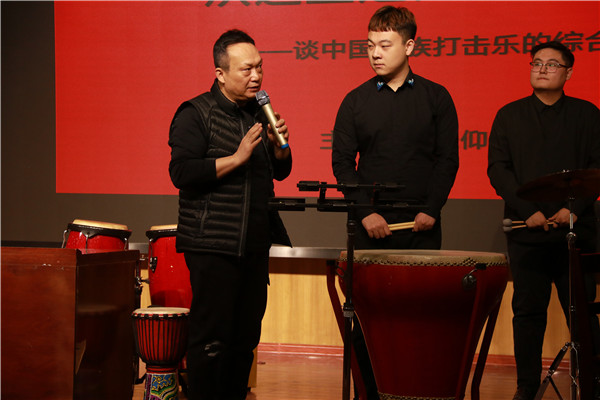 互动环节,张仰胜通过赏析他创作的优秀作品《鼓动神州》《风入松》《山魈》和《八佾》,指出打击乐演奏的要诀:一是音色,二是演奏。所谓演即在舞台上表演,而奏即指在侧台伴奏。他现场对戏曲学院孔勇老师创作、戏曲学院学生演奏的打击乐曲目《母亲河的呐喊》进行了指导,指出优秀的乐手应具备的三个特性:即奏、看、听,要演奏准确,看好指挥,并认真听乐队,讲求心灵的默契与代入感。同学们在现场感受到了打击乐的震撼,也领略到了张教授丰富的舞台经验与深厚的艺术造诣。