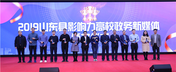 12月20日,由山东省互联网传媒集团主办的山东高校品牌建设与传播管理研讨会暨2019山东最佳社会声誉高校颁奖仪式在临沂大学举行,会议现场发布了“2019年度山东最佳社会声誉高校”榜单与“2019年度山东最具影响力高校政务新媒体榜”榜单。我校荣获“2019年度山东最佳社会声誉高校”“2019年度山东最具影响力高校政务新媒体”和大众网海报新闻2019年度优质用户全部三个奖项。山东省教育厅(省委教育工委)办公室调研员、新闻中心主任宋全政,省网媒集团党委常委、副总经理姜长勇为获奖单位颁奖。全省108所院校参与评选活动。