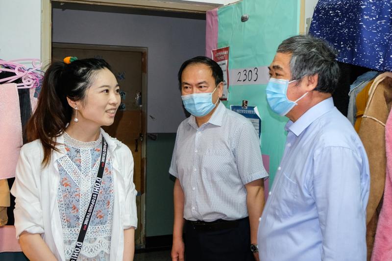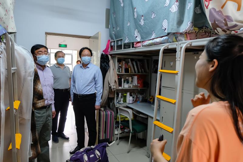 校领导先后到校门口接待点、学生公寓慰问返校学生,与他们进行亲切交谈。马东骅对同学们的平安归来表示热烈欢迎!他关切地询问学生返校方式、防护措施等情况,叮嘱他们注意个人防护,保持良好心态,保持宿舍环境卫生和良好通风状态,配合学校做好疫情防控工作。王力克详细询问同学们有关线上教学、返校后学习生活等方面情况,勉励同学们要保持良好的心态,认真学习,积极适应特殊时期教育教学上的一些新变化。