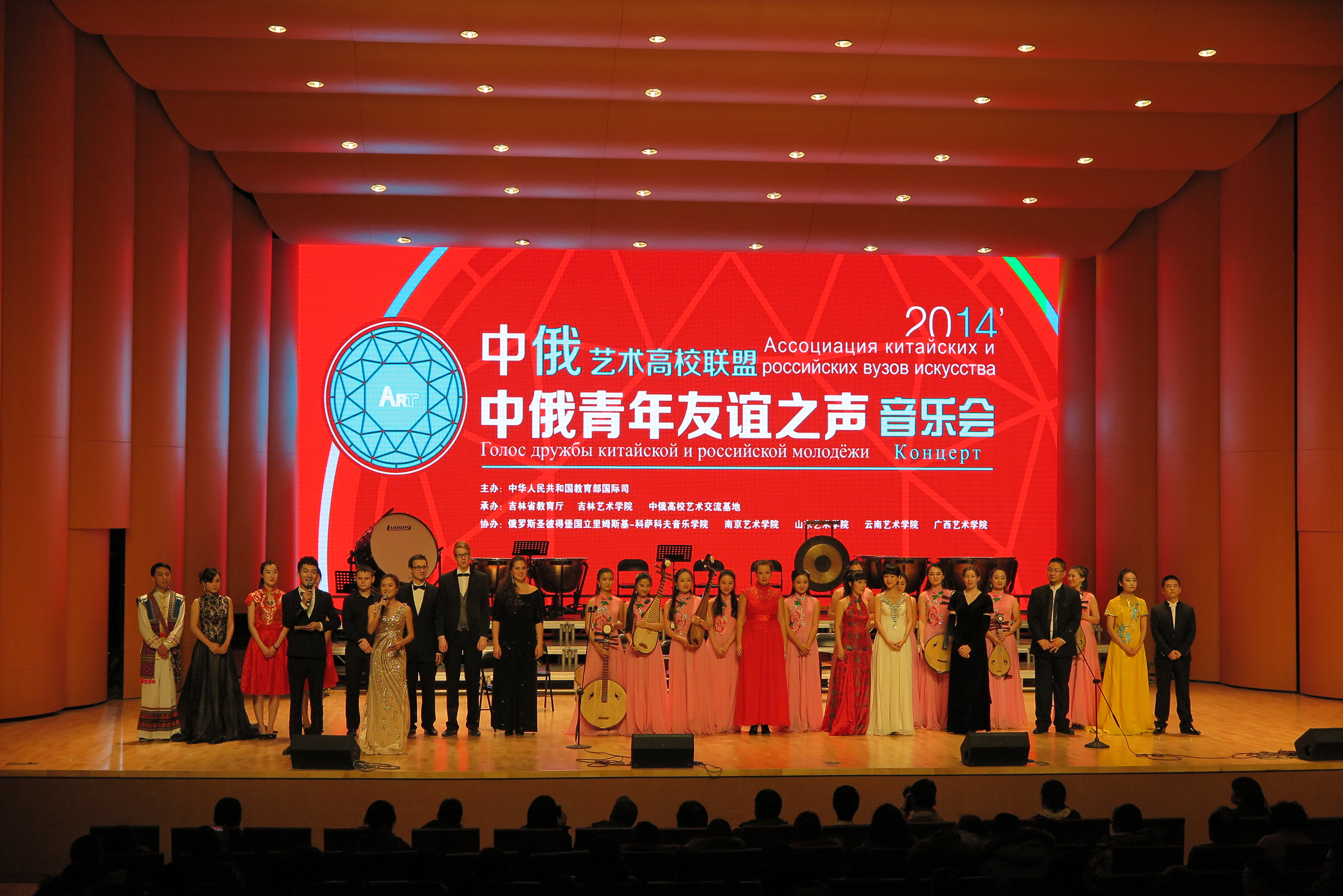 近日,由国家教育部国际司主办的中俄艺术高校联盟2014年中俄青年友谊之声大型交流活动在吉林艺术学院举行。我校国际交流合作处、音乐学院女子弹拨乐队共11人赴长春参加了活动,我校获得了由中俄青年友谊之声、中俄艺术高校联盟和中俄艺术交流基地颁发的“特殊贡献奖”。交流活动仪式在长影音乐厅隆重举行,中俄两国艺术高校学子们分别演出了精彩的节目,奉献了一台具有浓厚民族特色的视听盛宴。我校女子弹拨乐队演出了两个曲目,其中合奏《春之舞》做为音乐会压轴节目,博得全场热烈的掌声。