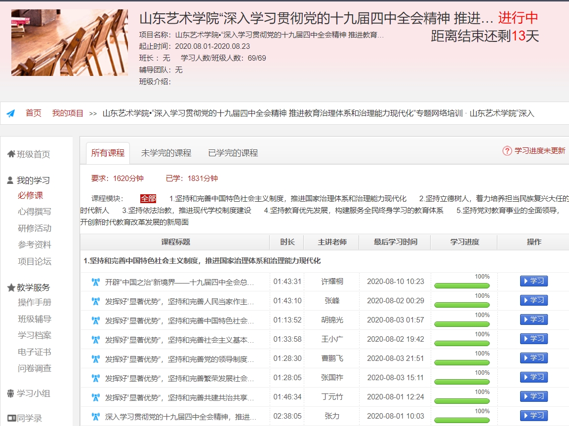 学校党委高度重视本次专题学习培训,制定专门学习培训计划和方案,根据疫情防控工作要求,委托国家教育行政学院,依托“中国教育干部网络学院”学习平台开展学习培训工作。学习培训期间,学员们在自学基础上,听取了“坚持和完善中国特色社会主义制度,推进教育治理体系和治理能力现代化”“坚持依法治教,推进现代学校制度建设”“坚持立德树人,着力培养担当民族复兴大任的时代新人”“坚持教育优先发展,构建服务全民终身学习的教育体系”“坚持党对教育事业的全面领导,开创新时代教育改革发展的新局面”5个课程模块、20场、1831学时的辅导报告,并结合各自工作和所学所思所悟,认真撰写、提交了学习心得。所有学员均按要求完成规定学习任务,顺利结业。