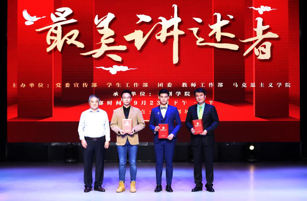 比赛现场,来自各教学单位的9名教师和12名学生,在认真学习党史、新中国史、改革开放史、社会主义发展史和习近平总书记关于新冠肺炎疫情防控工作的重要讲话及指示批示精神的基础上,结合个人学习感悟与成长体会,以故事讲述、感悟分享等方式,依次进行了讲述展示。通过一段段充满家国情怀的故事,一个个真实感人的案例,参赛选手或充满深情、或慷慨激昂地向大家讲述了中国共产党的故事、新中国的故事、改革开放和社会主义的故事以及抗疫故事,讲述了自己与祖国共奋进、与时代同发展的成长故事,持续激发了爱党爱国爱社会主义的巨大热情,坚定了永远跟党走、奋进新时代的信念和决心。现场观众深受感动,倍受鼓舞,不时报以热烈的的掌声。经过激烈角逐,戏剧学院张骁将、李耀国、王瑞基师生三人在众多讲述者中脱颖而出,荣获一等奖,并将代表学校参加省教育厅组织的“最美讲述者”评选活动。另有6名师生获二等奖,12名师生获三等奖。