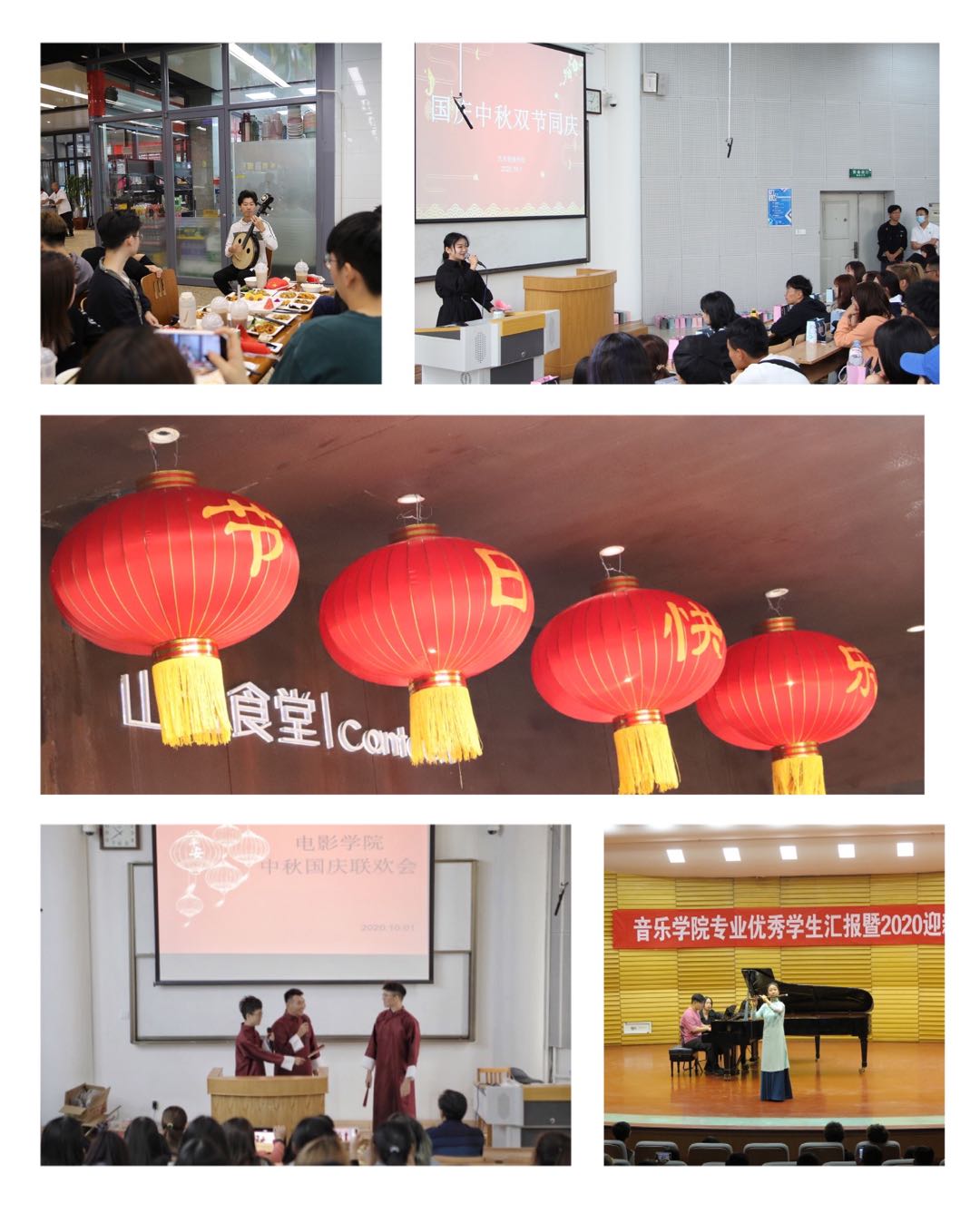 学校其他二级学院也都举行了丰富多彩、形式多样的节日活动,和同学们一起喜迎中秋,祝福祖国。音乐学院举办了专业优秀学生汇报暨2020迎新音乐会,现代音乐学院师生共进午餐,传媒学院、电影学院举行了联欢晚会并组织了主题党日观影活动,艺术管理学院、书法学院等举行了师生联欢活动,向学生赠送餐券及月饼,校园里到处洋溢着欢歌笑语和温馨祥和的氛围。