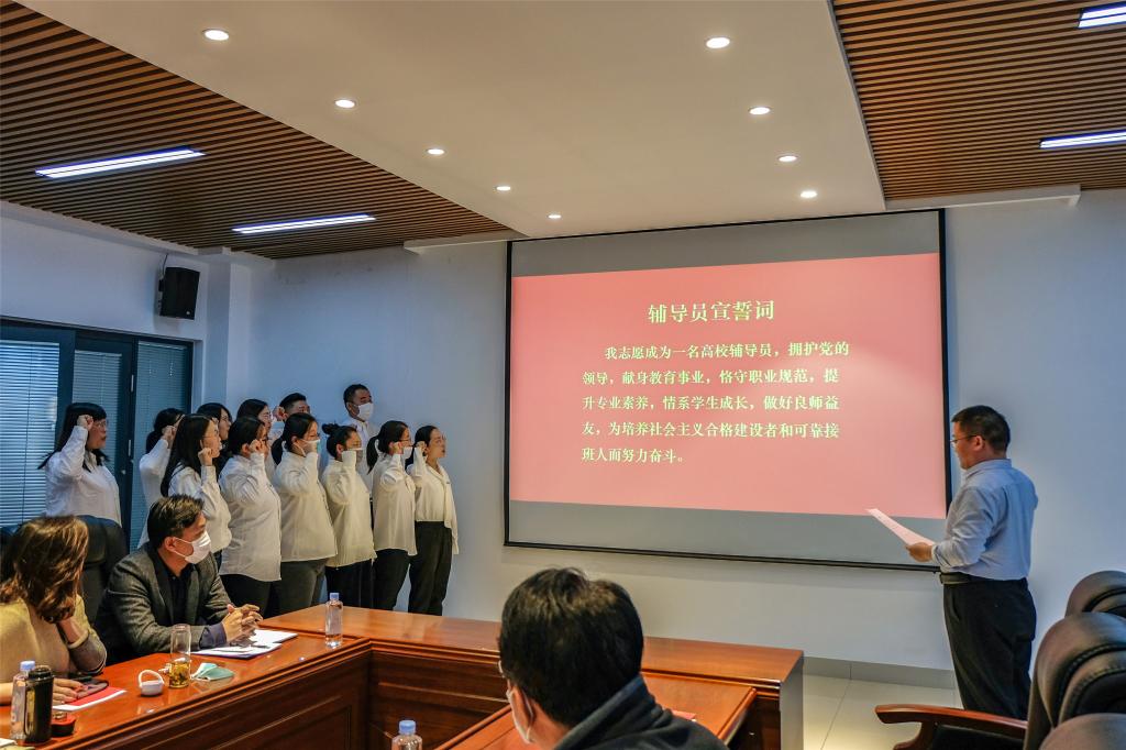 庄严的辅导员宣誓仪式上,新入职的12名博士辅导员进行了集体宣誓。新入职辅导员代表发言表达了信心和决心,优秀辅导员代表发言分享了收获和体会。