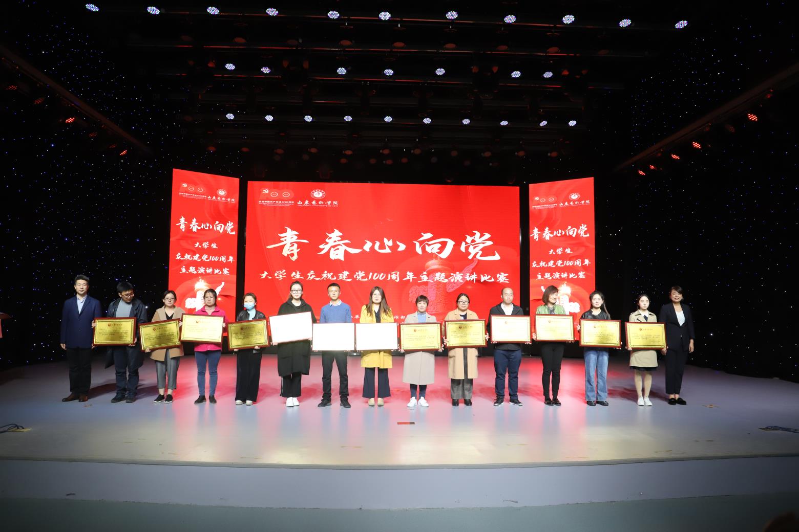 本次比赛分为初赛和复赛两个阶段。3月8日至3月26日为初赛阶段,各二级学院精心组织,广泛发动,全体同学踊跃报名参加,经过初赛选拔,各二级学院共有72名优秀选手进入学校复赛。复赛中,同学们用慷慨激昂的语言回望党的光辉奋斗历程,用生动真挚的话语抒发对党的无限崇敬之情,深情表达了我校大学生的爱国之心、强国之愿、报国之志。经过激烈角逐,最终决出一等奖5名、二等奖10名、三等奖20名,并评选出优秀组织奖13个。特邀评委山东广播电视台首席主持人小新和我校马克思主义学院院长刘荣进行精彩点评。出席活动的领导和评委为获奖选手和优秀组织单位颁发了证书和奖状。