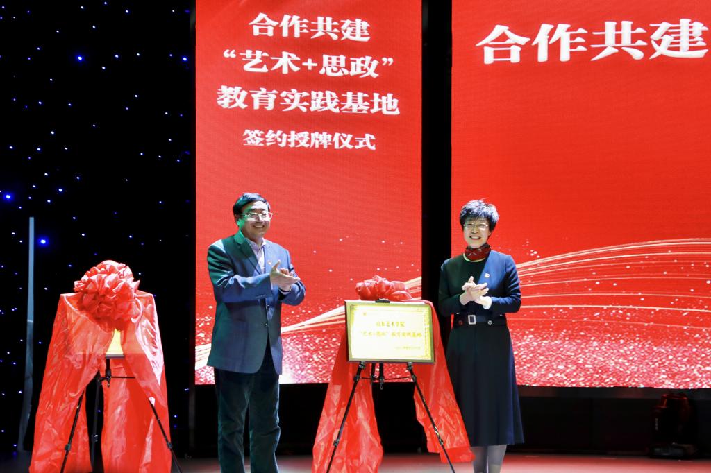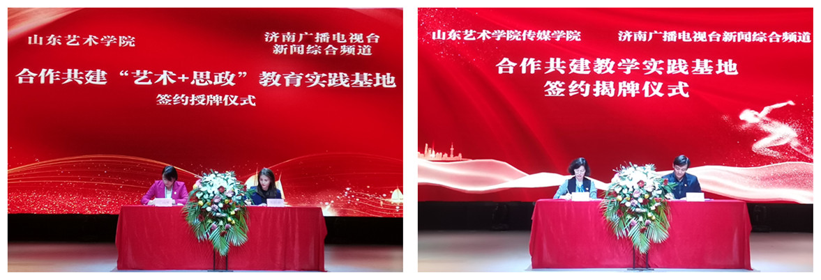 孔祥华、许莉分别致辞,表示希望通过学校与媒体党团联合的“艺术+思政+传播”创新形式,促进双方单位广泛沟通、亲密联姻、深度合作,让党史学习教育更深入、更鲜活,让青年学生们对历史和未来、对自己的责任担当有更清晰的认识和理解,在专业建设、教育教学、社会实践等方面收获更好的风景、更好的故事、更好的成果,以更加优异成绩向党的百年华诞献礼。与会领导共同为“山东艺术学院‘ 艺术+思政’教育实践基地”“山东艺术学院传媒学院教学实践基地”“榜样公益联盟山东艺术学院传媒学院学生会”揭牌。双方相关领导共同签署了“艺术+思政”教育实践基地共建协议书和教学实践基地协议书。