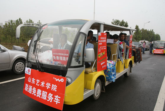 12日为本专科生报到时间。清晨,学校迎新工作准备就绪,工作人员一大早便来到工作场所,等待前来办理手续的新生。学校两校区LED电子显示屏和条幅上的“珍惜新起点,笑迎新生活”、“青山碧水喜迎今日山艺学子,闳约深美涵养明天艺苑英才”等标语以及长清校区全彩屏向新生和家长播放的学校宣传片烘托了迎新气氛。醒目的“新生报到须知”、“绿色通道受理处”、“报到咨询处”、“家长休息饮水处”、“临时停车场”等为新生及家长指明了报到流程。为缓解学生和家长的旅途劳累,学校还安排了12辆免费摆渡车,帮助新生搬运行李。