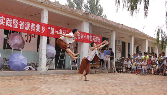 次日上午,舞蹈学院师生又来到位于郓城黄集乡姬庄的长刘希望小学,为小学生们带去了同样精彩的舞蹈盛宴。县教育局局长吕端方、黄集乡党委书记何广峰和小学的全体师生参加了演出活动。没有舞台、没有灯光,演员们克服种种困难,在砖地上以饱满的热情和专业的水准完成了整场演出,演员们的顽强表现和小学生们一双双求知渴望的眼睛,让在场的人员不禁为之动容。其中双人舞《一条红领巾》尤其受到在场小学生们的喜爱,得到了最热烈的掌声。