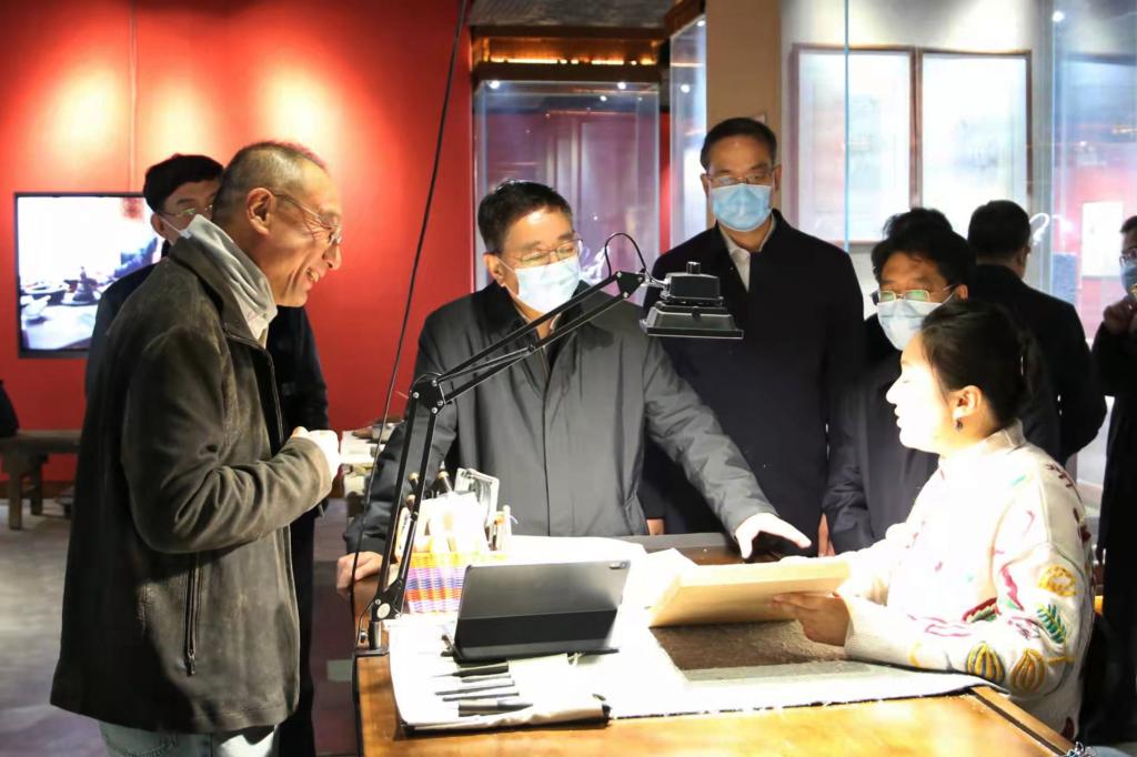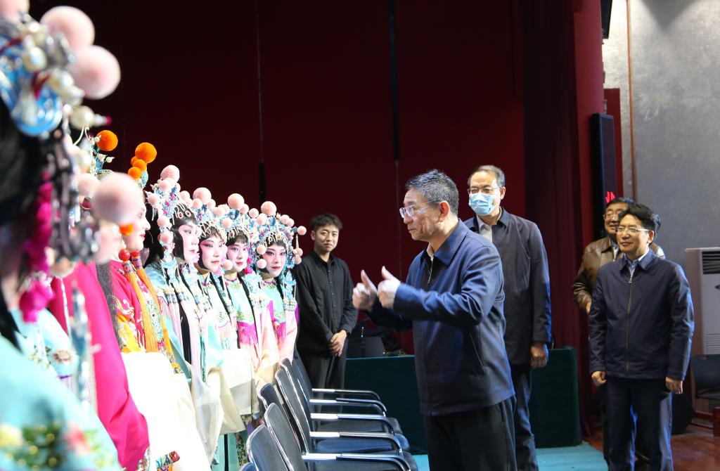白玉刚一行首先来到文东校区,观摩了音乐学院教育教学成果展示,勉励师生们不断提高专业水平,走上更大的舞台,争取更大荣誉。随后,白玉刚一行来到长清校区,在美术学院美术馆观摩了“真实的深度——2021中国写实画派十七周年作品展”。展厅内,一幅幅画作各具特色,白玉刚详细了解作品创作、展示等情况,认真观看每一幅作品。在艺术博物馆,白玉刚考察了教育部中华优秀传统文化基地“山东年画雕版博物馆”,当听到馆藏有以清代为主的年画雕版千余块、各类年画上万幅的介绍时,白玉刚要求学校在做好保护工作的同时,加强研究,充分发挥馆藏资源的作用,服务教学科研,开展文化交流和传播推广,积极探索优秀传统文化服务大众美育的有效路径。在戏曲学院,白玉刚观摩了“名家传戏”项目排演的京剧《状元媒》片段,白玉刚对师生们矢志传承中华优秀传统文化的精神表示赞赏,勉励同学们努力向京剧前辈学习,砥砺艺术初心,探寻艺术真谛,勤学苦练,把京剧艺术继承下来、传承下去。