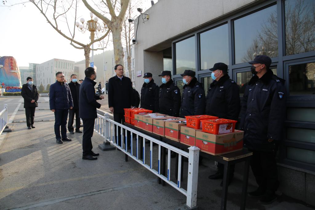 王洪禹一行来到文东校区保健科卫生室、学生公寓及校门值勤室,长清校区校门值勤室、办公楼值班室、学生公寓值班室等处,看望坚守岗位的干部职工,为他们送上节日慰问品。每到一处,校领导都与值班干部职工亲切交流,悉心询问大家的工作、生活等情况,详细了解节日期间的疫情防控、安全保卫、后勤保障等工作开展情况,对他们恪尽职守、严谨规范地开展工作给予高度认可,对他们爱岗敬业的态度和乐于奉献的精神给予充分肯定,并勉励大家保重身体,全力以赴做好各项服务保障工作。