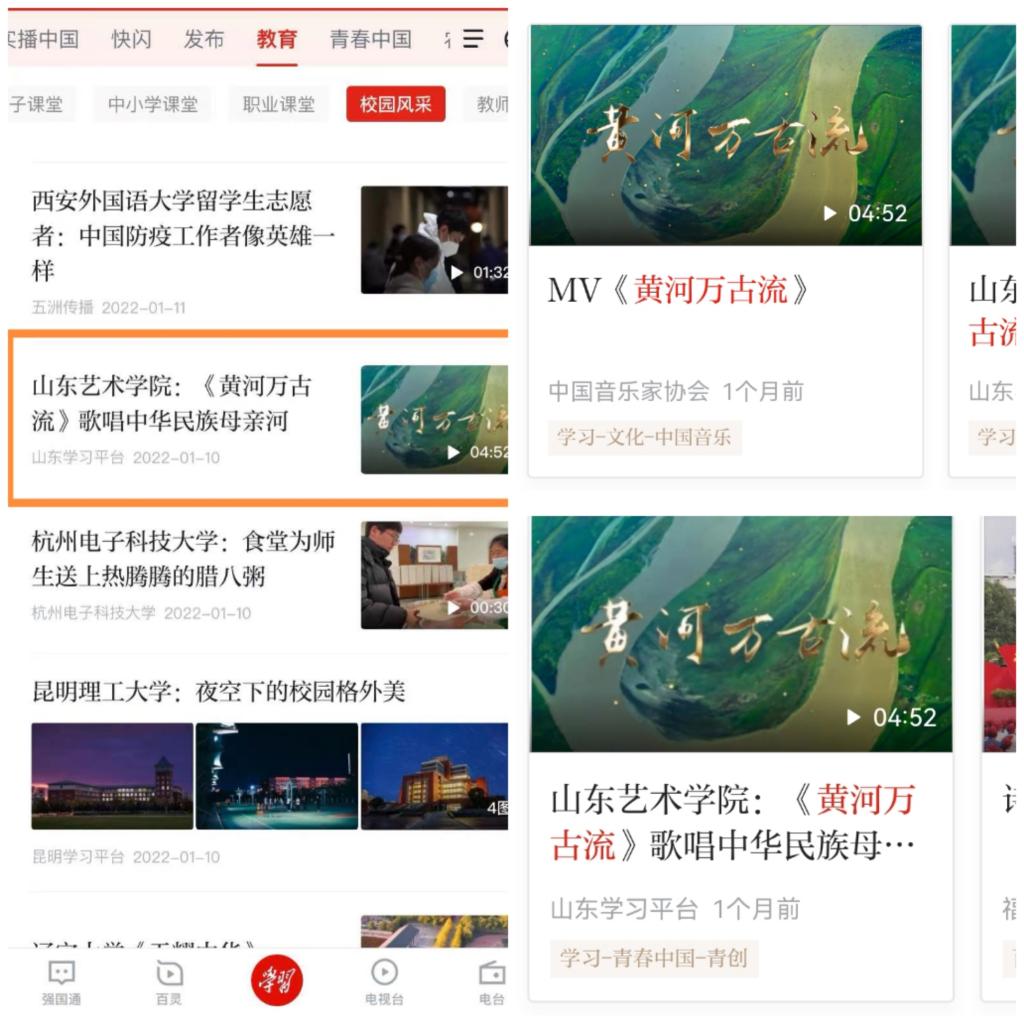1月5日,山东艺术学院音乐学院院长、教授李云涛作曲的歌曲《黄河万古流》在“学习强国”山东学习平台发布,10日被推荐到“学习强国”学习平台展示,分别被“学习-教育-校园风采”“学习-青春中国-青创”“学习-文化-中国音乐”栏目收录。