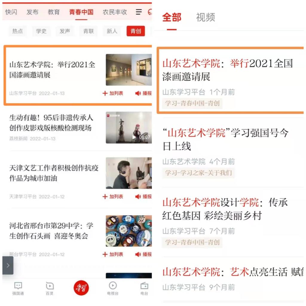 1月10日,《山东艺术学院:2021全国漆画邀请展开幕》在“学习强国”山东学习平台发布,1月13日被推荐到“学习强国”学习平台展示,被“学习-青春中国-青创”栏目收录。