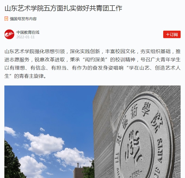 1月11日,“学习强国”中国教育在线强国号发布《山东艺术学院五方面扎实做好共青团工作》,文章从思想引领、校园文化、社会实践、创新创业和基层团建等五方面全面叙述了如何做好高校的共青团工作。
