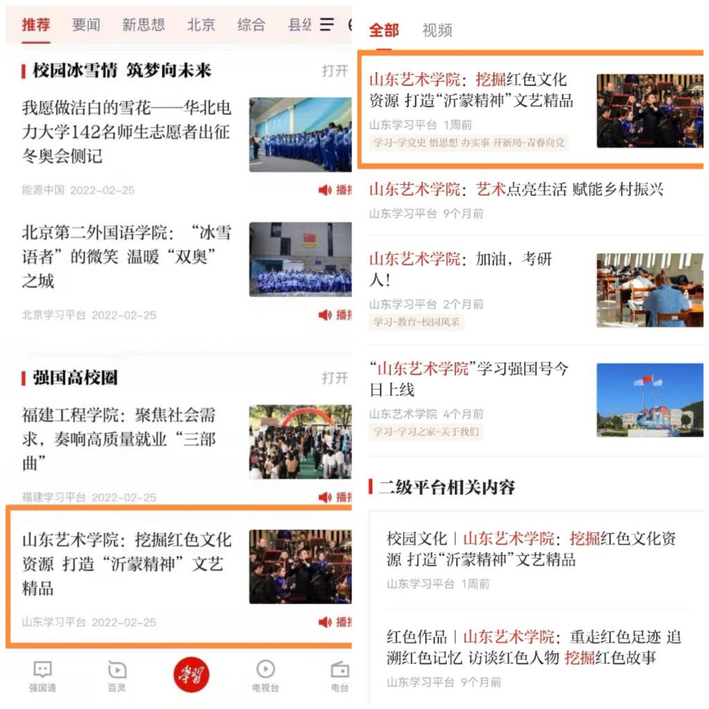 2月23日,《山东艺术学院:挖掘红色文化资源 打造“沂蒙精神”文艺精品》登上“学习强国”山东学习平台,2月25日被推荐到“学习强国”学习平台首页“强国高校圈”展示并收录在“学习-学党史 悟思想 办实事 开新局-青春向党”栏目里。文章详细描述了山东艺术学院组织师生开展下乡采风活动,深入挖掘山东深厚红色文化资源,投身沂蒙精神科研创作,打造沂蒙精神文艺精品的经验和事迹。