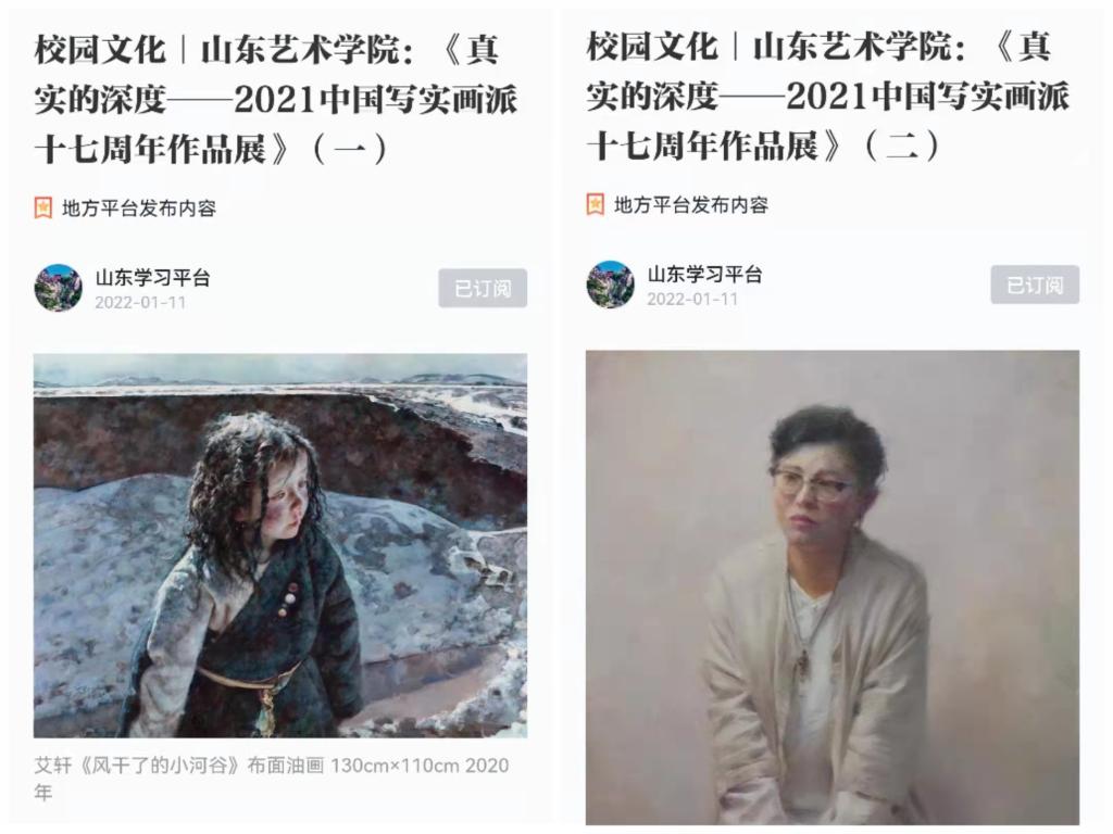 1月11日,山东艺术学院《真实的深度——2021中国写实画派十七周年作品展》画展作品登上“学习强国”山东学习平台,画展由山东艺术学院和中国写实画派共同主办,在山东艺术学院(长清校区)美术学院美术馆展出。画展汇集了30余位中国写实画派画家的写实油画新作,一幅幅关注社会现实的绘画作品经典唯美地呈现在观众面前。画家们坚持以卓越精湛的绘画技巧、唯美的视觉艺术语言和深沉悠远的审美趣味体现着中国时代风云的变迁。