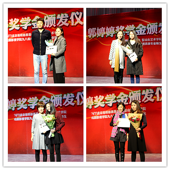 随后,王力克、郭婷婷、孙德成以及98级戏剧系表演专业校友张馨元、李雅菂、黄潇潇、冯永慧、韩霄琳依次为首届山东艺术学院郭婷婷奖学金开奖,并给获奖学生颁奖。