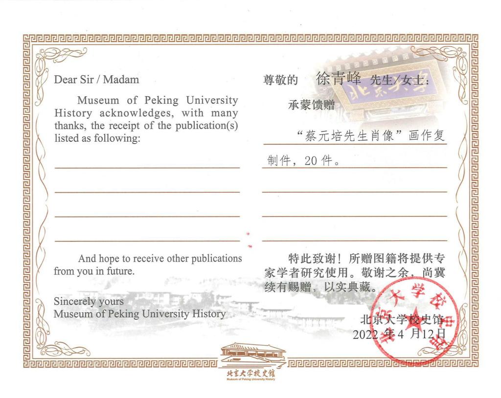 《蔡元培先生像》问世后,受到社会各界高度认可。本次限量复制版画选用哈内姆勒博物馆级无酸纸、使用高清艺术微喷复制技术,真实还原了作品原貌,限量复制版画共99件,其中编号为2—21共计20件捐赠给了北京大学。徐青峰创作的《蔡元培先生像》构图精巧、笔触细腻、意蕴深远,与北大厚重的历史底蕴及浓郁的人文气息相得益彰,浑然相融,画作除北京大学校史馆收藏外,北京大学还决定将此作品以校礼的形式,赠予访问北大的重要人士及国外大学校长。
