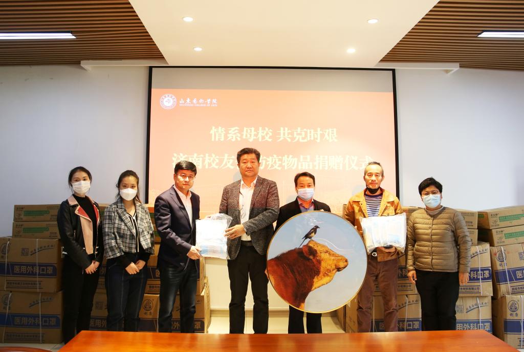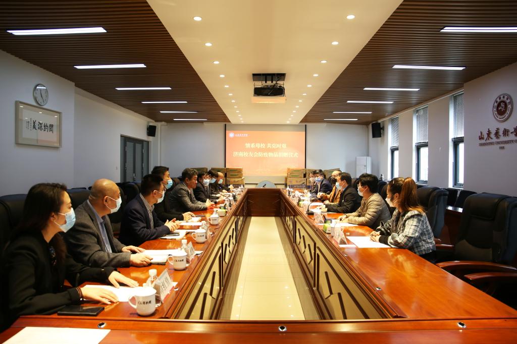 防疫物品捐赠仪式在长清校区办公楼第一会议室举行。山艺济南校友会副会长兼秘书长赵军、济南天山实验学校校长马晓光、济南瑞新生物科技有限公司董事长付文源等代表,徐青峰、党委副书记孔祥华和学校防疫办、党办院办、宣传部、发展规划处(校友办)、后勤管理处、资产管理处等部门负责同志参加仪式。
