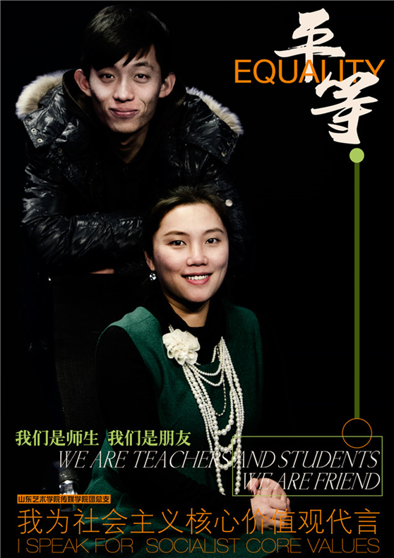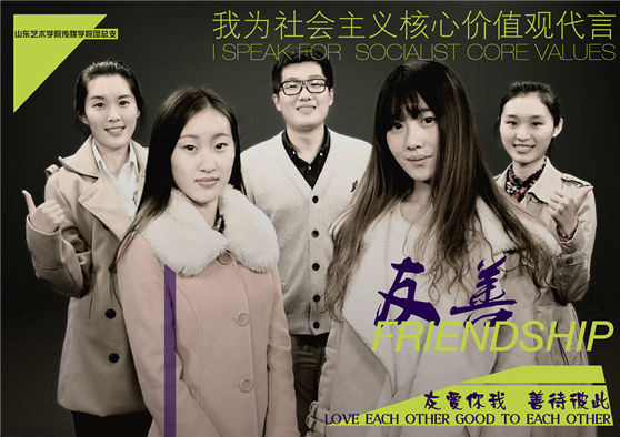 我来做代言,传递正能量。近日,山东艺术学院传媒学院就推出“我为社会主义核心价值观代言”的活动,由学生自己制作自己代言社会主义核心价值观海报。此次活动,用大学生自己的“语言”,通过一个普通的艺术类大学生的视角,将原本“高大上”的平面文字,转变成为生动的艺术传达,成为了师生喜闻乐见的宣传教育活动,“社会主义核心价值观这12个词就在我们身边,无时无刻,随时随地。”参与代言的2013级广播电视编导专业学生密凯如是说。活动推出后,人民网、中新网、凤凰网、新浪网、网易新闻、腾讯网、齐鲁网、《齐鲁晚报》、《羊城晚报》等多家媒体竞相转载报道,在网络、论坛上也引起了广大网友的热议和广泛关注。