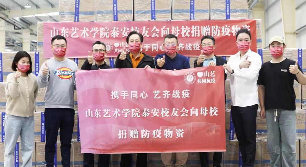 校友张爱民、丁壮、王冠超等代表泰安校友会,向母校捐赠防疫口罩10万枚、矿泉水2万瓶。
