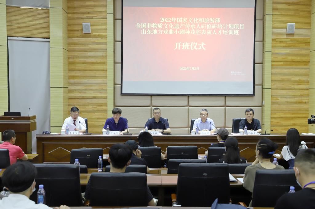 7月3日上午,2022年国家文化和旅游部全国非物质文化遗产传承人研修研培计划项目——山东地方戏曲小剧种茂腔表演人才培训班开班仪式在我校长清校区举行。山东省文化和旅游厅非遗处副处长蒋士秋,学校党委委员、副院长苏茂兴出席仪式并致辞,艺术实践与创作处、戏曲学院相关负责人及师生代表,研修班全体学员参加开班仪式。