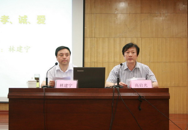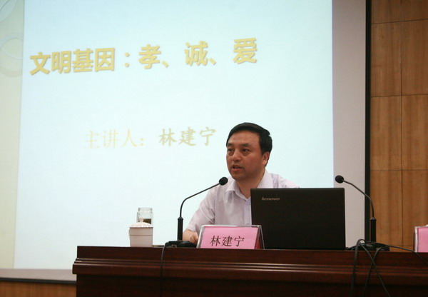 为更好地培育和践行社会主义核心价值观,更加全面准确地理解和把握社会主义核心价值观的精神实质,5月22日下午,学校邀请省委宣传部副部长林建宁同志来到我校,在长清校区图书馆报告厅为师生们作了题为《文明基因:孝、诚、爱》的专题报告。校领导班子成员,科级以上干部、党支部书记、当天无课的教师、党外代表人士、辅导员及部分学生代表参加报告会。报告会由副院长高启光主持。