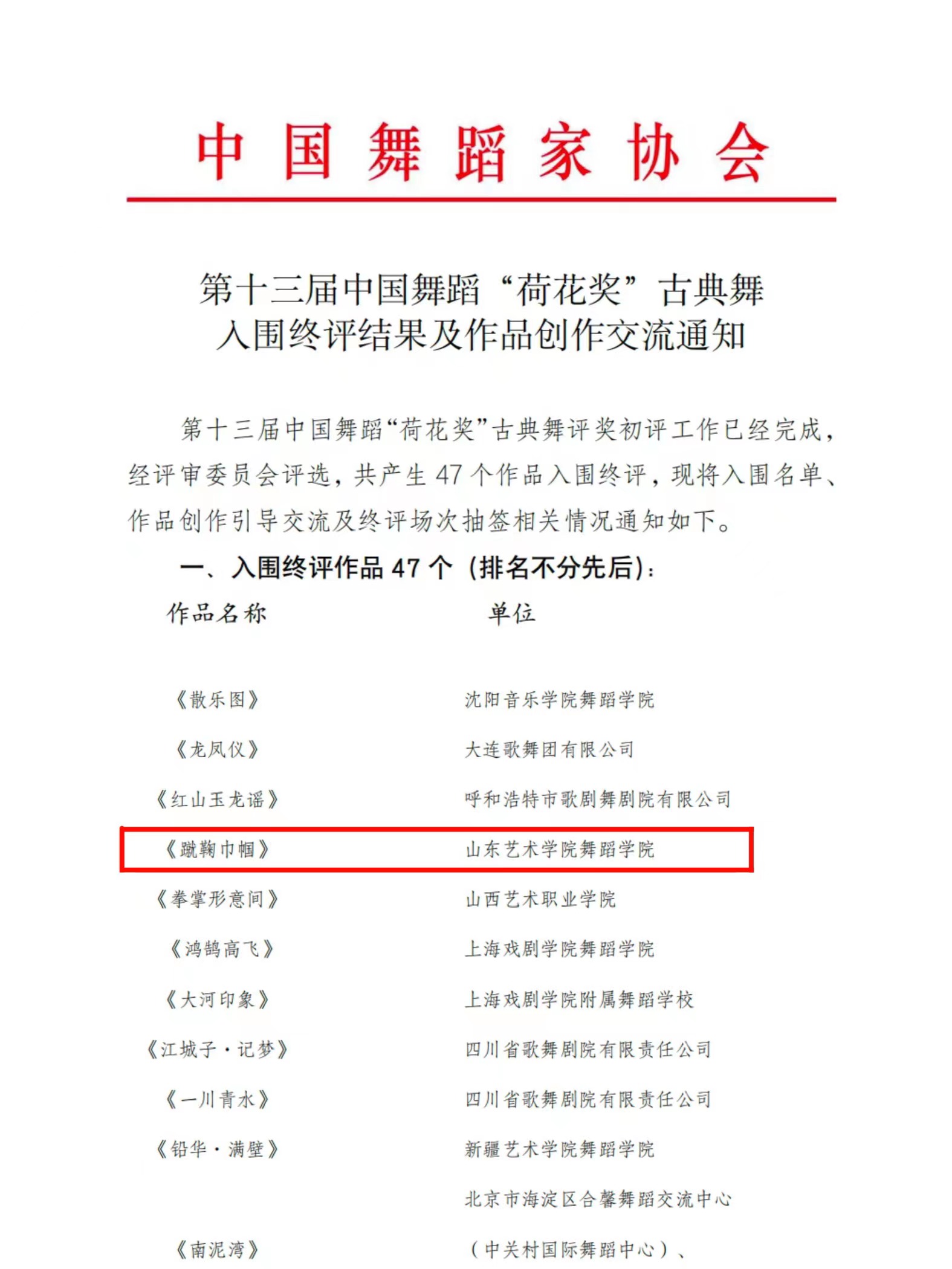 《蹴鞠巾帼》由我校舞蹈学院副教授刘忠独立编创,作品以明代蹴鞠女艺人彭云秀为创作原型,以中国古典舞为语汇进行动作本体探究,彰显了一群古代蹴鞠女艺人女扮男装为国争光的家国情怀,诠释了“巾帼不让须眉”的魅力风采,进一步深挖了中华优秀传统文化的当代性创作转化。据悉,共有47个作品入围第十三届中国舞蹈“荷花奖”古典舞终评,我校作品的入围填补了山东省在中国古典舞创作领域的一项空白,同时,我校也是本次评选中山东省唯一有作品入选的单位。